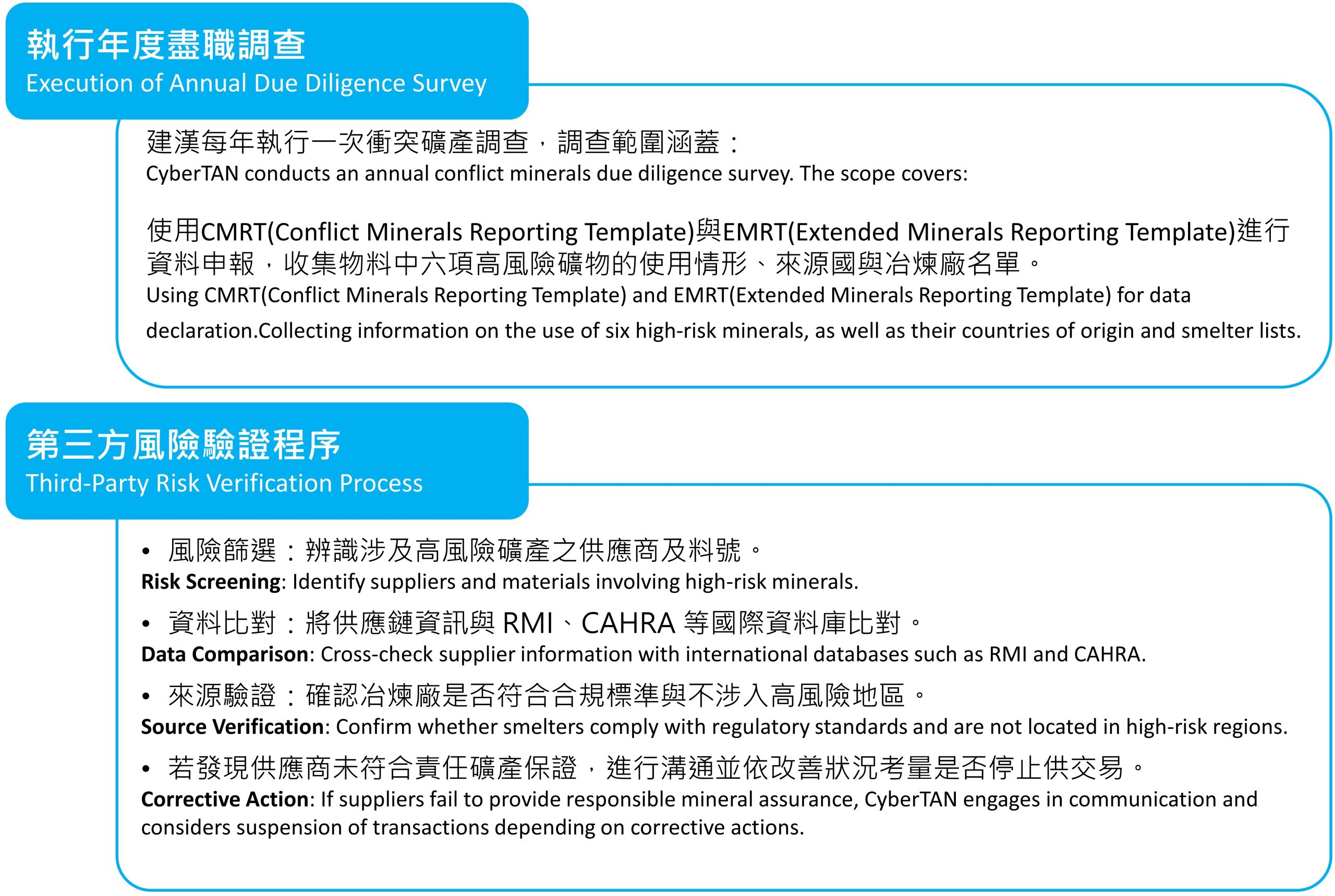 依據RBA及其支援之「責任礦產倡議」的定義與實務應用,識別下列六項高風險原材料並需進行盡職調查對象:金(Gold)、雲母(Mica)、鈷(Cobalt)、鉭(Ta)、錫(Tin)、鎢(Tungsten),以確保上述礦產非來自於武裝衝突地區或高風險地區(可能涉及嚴重人權侵犯與非法開採行為),並透過以下流程進行管理。