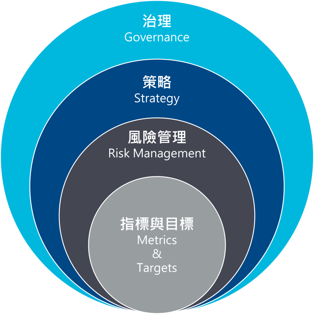 | 治理 | 治理階層對氣候風險與機會進行監督及治理 | 董事會為監督氣候議題管理之最高治理單位,監督氣候議題管理,確認氣候相關目標達成情形。由永續委員會直接參與監督及管理本公司在氣候議題之表現及風險管理,做出最終決策,並持續推動董事會於決議重要事項時,會考量氣候議題及其風險和機會,以及利害關係人之意見,並每季回報董事會進行報告。 |