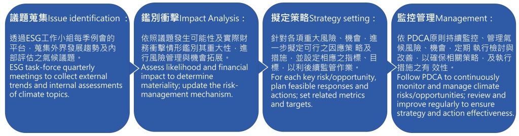| 風險管理 | 建立氣候風險鑑別、評估及管理流程 | 持續掌握國內外規範趨勢,定期評估各項風險與機會之衝擊程度及重大性,擬定相應策略,導入管理流程(依 PDCA 原則)與監測指標,凡是掌握中,即時因應。 |