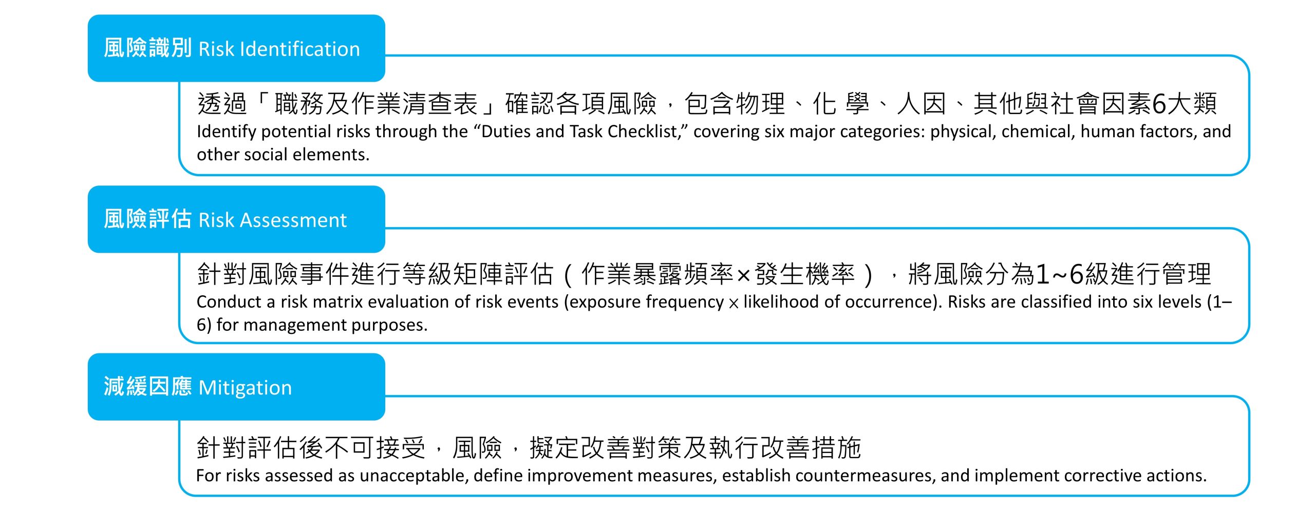 針對各項作業可能造成人員傷害或事故進行全面定期及不定期危害鑑別與風險評估,並透過矩陣分析,(可能性、嚴重度、頻率)評估風險等級,針對高風險項目提出相對應管控措施與目標,並對管理績效加以檢討及評估其控制效果。